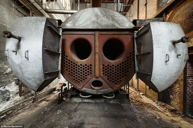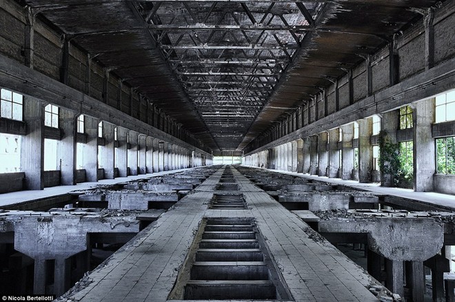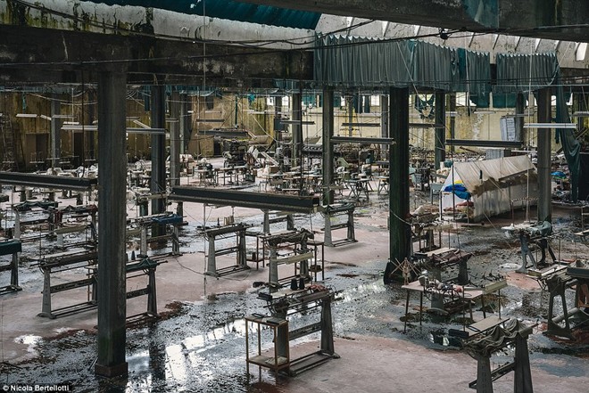 | Nhiếp ảnh gia Bertellotti đã khám phá và ghi lại những công trình bị bỏ hoang qua nhiều thập kỷ, cho đến khi chúng chịu cúi đầu trước sự tàn phá của thời gian. Ảnh chụp tại một nhà máy bỏ hoang từ lâu, mái nhà đã hư hỏng khiến nước mưa dột chảy xuống nền nhà. |