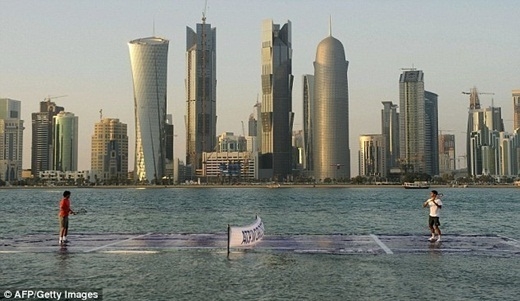 Rafael Nadal và Roger Federer đang chơi tennis ở mặt sân trên nước độc nhất vô nhị.
