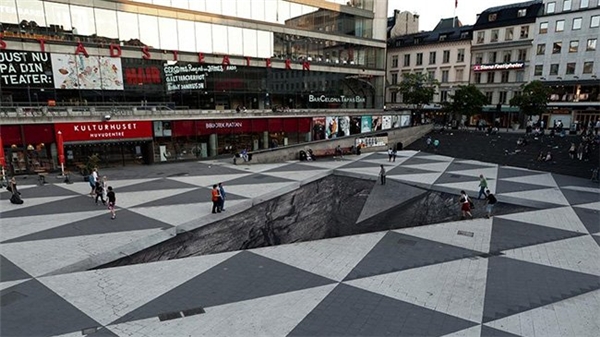 Ngỡ tưởng là mô hình nhưng đây thực chất là một bức tranh vẽ dưới mặt đường.
