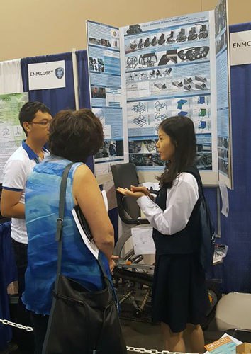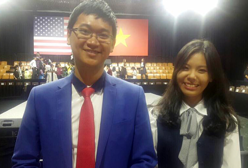 Hai bạn trẻ trao đổi với người quan tâm tại cuộc thi ở Mỹ.