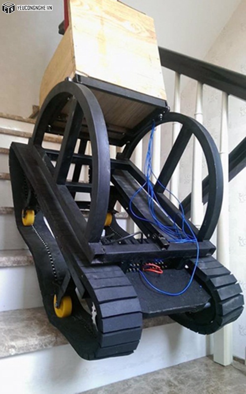 Xe lăn sáng chế vượt địa hình cầu thang bằng bánh mô phỏng xích xe tăng.