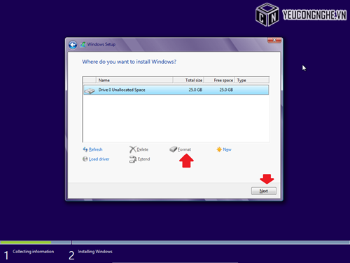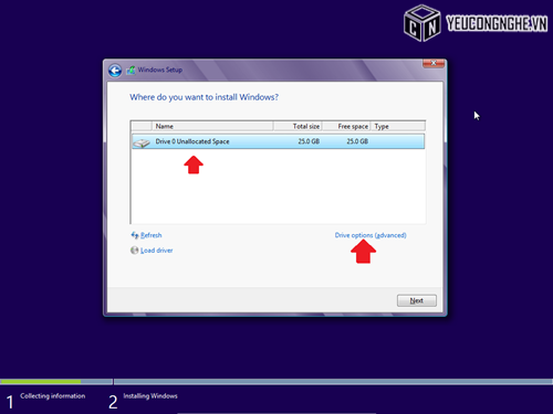 Do tùy chọn cài đặt là Custom nên ở bước tiếp theo thuật sĩ cài đặt Win 8 sẽ yêu cầu các bạn chọn phân vùng để cài đặt Windows 8, hãy chọn một phân vùng trống không chứa bất kỳ dữ liệu nào và có dung lượng trống tối thiểu là 20 GB để cài đặt.