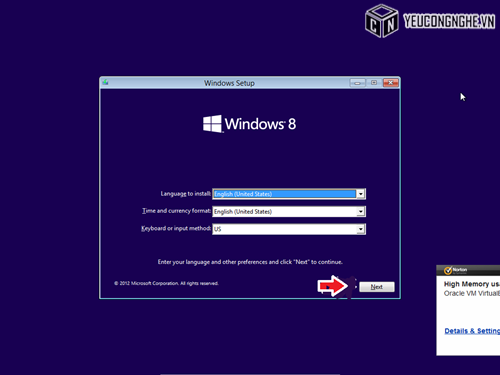 Tại cửa sổ giao diện thuật sĩ cài đặt Windows 8, các bạn hãy chọn ngôn ngữ cài đặt (Language to install), định dạng thời gian (Time and currency format) và phương thức nhập bàn phím (Keyboard and input method) rồi sau đó Nhấn Next để tiếp tục.