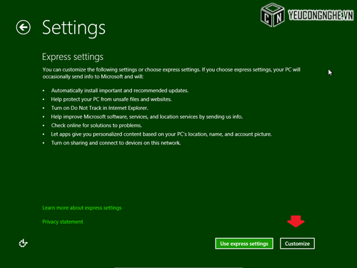 Nếu bạn không phải là một chuyên gia máy tính hay là một người dùng có kinh nghiệm về Windows, hãy nhấn vào “Use express settings” ở bước thiết lập tiếp theo để chọn sử dụng các thiết lập mặc định của Windows 8.Chọn customizekhi bạn hiểu tiếng ANH và muốn tùy biến cho mình.
