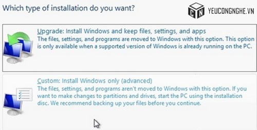 Ở bước tiếp theo thuật sĩ cài đặt Win8 sẽ đưa ra cho bạn 2 tùy chọn cài đặt: Upgrade – Nâng cấp và Custom – Tùy chọn. Nếu bạn muốn nâng cấp trực tiếp từ phiên bản Windows đang sử dụng lên Windows 8, hãy chọn Upgrade. Ở bài viết này mình sẽ chọn Custom (advanced).