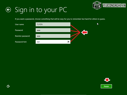 Nếu bạn chọn Local Account, một hộp thoại yêu cầu bạn khai báo tên và mật khẩu để tạo tài khoản đăng nhập vào Win 8 được hiện lên, hãy điền điền đủ thông tin vào các trường trong khung đăng ký rồi sau đó nhấn Next.