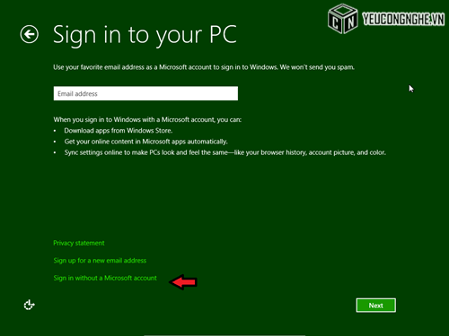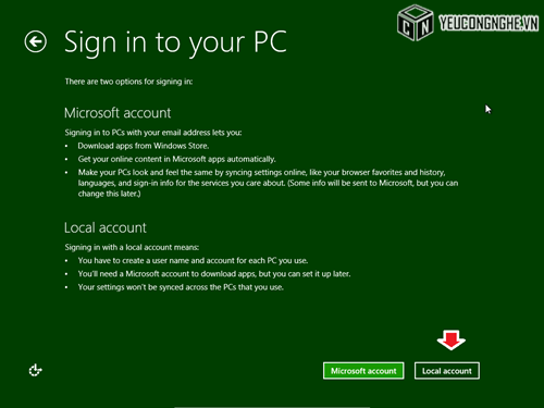 Tiếp theo, Windows 8 sẽ yêu cầu bạn đặng nhập vào tài khoản Windows Live ID của bạn để sử dụng. Nếu bạn không muốn sử dụng tính năng này, hãy nhấn vào mục “sign in without a Micorosoft account” rồi sau đó chọn Local Account ở hộp thoại hiện ra sau đó.