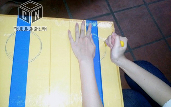 Công đoạn làm hết sức đơn giản: vẽ hình tròn rồi dùng dao tạo hai lỗ tròn theo hình đã vẽ, l