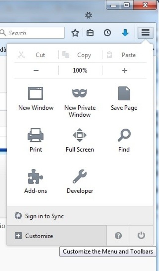 Để sử dụng chức năng này, đầu tiên bạn nhấn vào biểu tượng menu ở góc trên bên phải cửa sổ Firefox, sau đó nhấn nút “Customize” từ menu hiện ra.