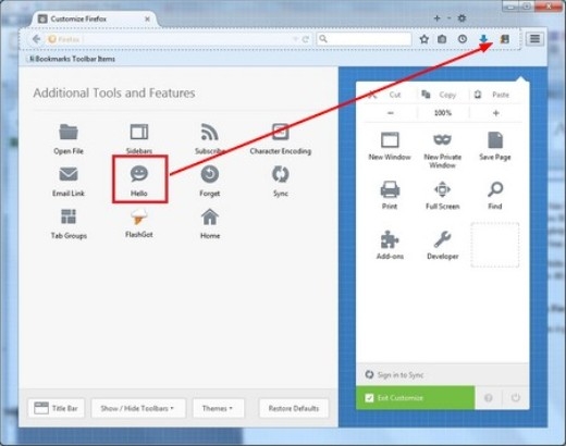 - Khởi động lại Firefox. Bây giờ truy cập vào mục “Customize” như đã hướng dẫn ở trên, sau đó kéo và thả biểu tượng “Hello” lên thanh công cụ của Firefox.