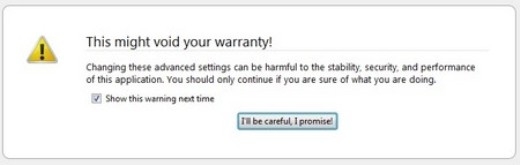 - Đầu tiên, gõ about:config vào thanh địa chỉ của Firefox, nhấn Enter. Nhấn vào nút “I’ll be careful, I promise” hiện ra ở bước sau đó.