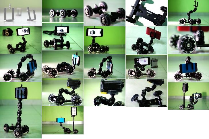 Rất đơn giản! Cánh tay của dolly có thể gấp khúc và các khớp đủ chắc chắn để giữ vững trọng lực của thiết bị gắn vào nó. Cánh tay gấp khúc này có thể được bẻ theo mọi hướng tuỳ ý người dùng. Bánh xe cũng có thể được chỉnh góc rất dễ dàng và thậm chí là chính xác với hai vòng số chỉ góc độ. Bánh xe gắn trên bề mặt chịu lực hoàn toàn được di chuyển trên bề mặt phẳng, nếu vấp phải một đồ vật gì, một mảnh vỡ nào đó trên đường nó di chuyển, chắc chắn sẽ tạo sự rung lắc.