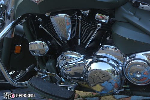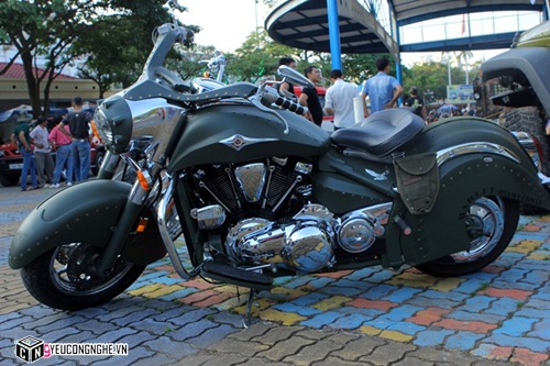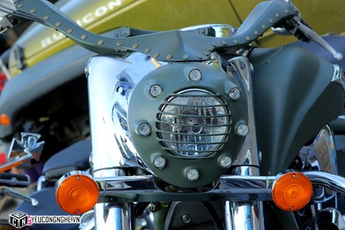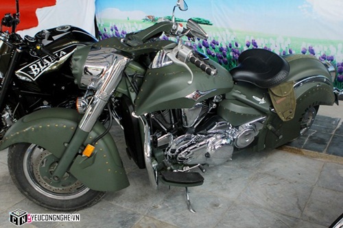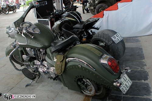 Chiếc Kawasaki Vulcan của biker Nguyễn Tiến Dũng ở Hà Nội nổi bật với dàn áo phong cách nhà binh. Theo chủ nhân của nó, đây là chiếc xe độ hiệu quả nhất trong loạt xe độ của anh. Việc độ cũng hoàn toàn do thợ Việt Nam thực hiện. |