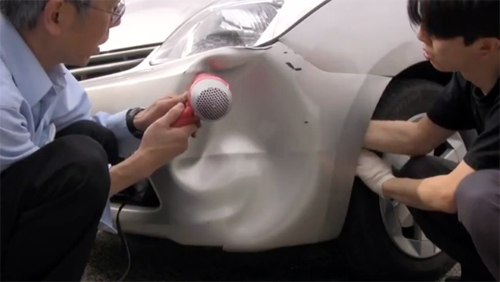 Tuy nhiên, có những giải pháp đầy bất ngờ mà phần lớn mọi người không biết đến có thể giúp tiết kiệm cả chi phí và thời gian. Một trong số đó là việc khắc phục vết lõm trên ba-đờ-sốc của một chiếc Toyota Prius của một gia đình người Nhật. Công việc không tốn mấy công sức và diễn ra rất nhanh.