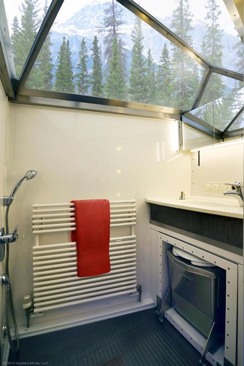 Khu vực "nhà tắm" có "cửa sổ trời" để tận dụng ánh sáng thiên nhiên, tiết kiệm nhiên liệu và khiến không gian thoáng đáng hơn. Có thể thấy một bồn cầu vệ sinh được cất giấu khá tinh tế trong phòng tắm di động này.
