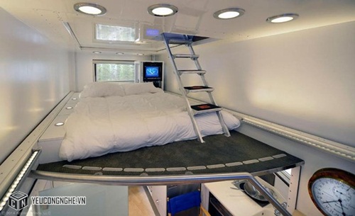 Bên trong xe còn có nguyên một phòng khách với ghế sofa bọc nỉ, đồng hồ thiết kế cổ điển ton-sur-ton với nội thất, máy tính tiện lợi cho việc giải trí, các thiết bị gia dụng như tủ lạnh,...