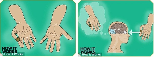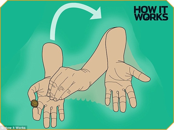 Tay trái lúc này giả vờ như đã cầm lấy đồng xu, và tất cả đều tin như vậy, do hành động này đã kích thích não bộ chú ý đến tay trái hơn. Kỳ thực đồng xu vẫn ở trong tay phải.