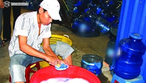 Hai công nhân dùng nước rửa chén (bát) khuấy đều với nước ở một chậu lớn, sau đó lần lượt đưa số bình dơ bẩn này vào xúc rửa thủ công. Một công nhân dùng nước rửa chén chùi nắp bình, một công nhân khác cho nước rửa chén vào bình súc xong rồi dùng vòi nước xịt lại bên trong, bên ngoài và đưa bình qua công đoạn đổ nước vào để bán ra thị trường.