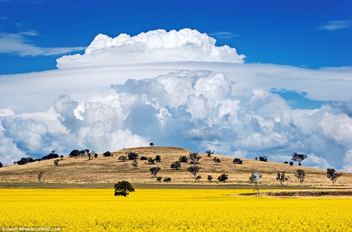 Mây tích tụ phía sau cánh đồng cải dầu gần Mullaley, trung tâm New South Wales.
