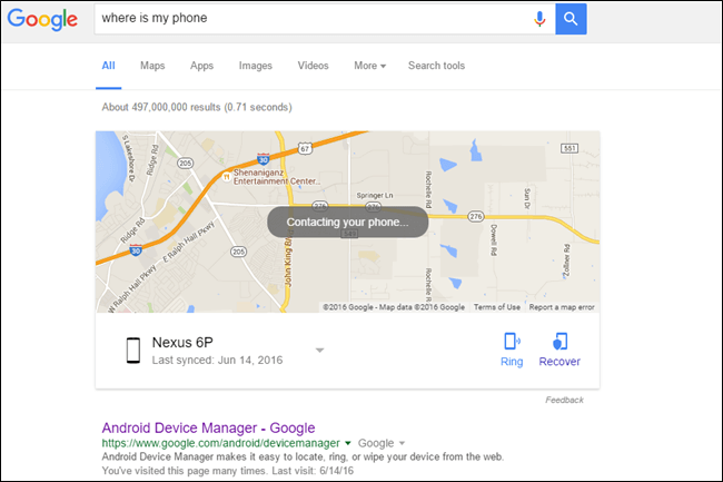 Thao tác này sẽ thực hiện một tìm kiếm, và Google sẽ tự động hiển thị một cửa sổ Android Device Manager nhỏ ở ngay trên đầu của trang kết quả tìm kiếm. Trong quá trình thử nghiệm, chúng tôi nhận thấy cửa sổ này khá khó sử dụng và độ chính xác không cao, vì vậy để nhanh chóng tìm lại điện thoại, bạn hãy nhấn vào liên kết với tên Android Device Manager, cũng nằm trên trang kết quả tìm kiếm.