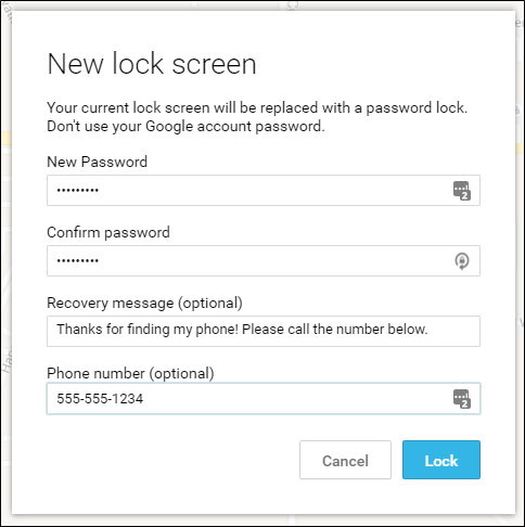 Để đảm bảo dữ liệu cá nhân của bạn được an toàn, bạn có thể sử dụng nút Lock (Khoá) để nhanh chóng kích hoạt mật khẩu cho Lock Screen (Màn hình Khoá), ngay cả khi bạn chưa bật nó trước đó. Sau khi thiết lập xong mật khẩu Lock Screen, bạn cũng có thể ra lệnh hiển thị một tin nhắn trên màn hình này với một thông điệp đại loại như "Cảm ơn bạn vì đã tìm thấy và giữ hộ điện thoại của tôi! Vui lòng gọi cho tôi vào số điện thoại dưới đây." Sau đó, hãy nhập số điện thoại của bạn vào ô bên dưới.