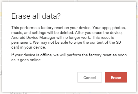 Cuối cùng, nếu tất cả mọi hy vọng điều tan biến, bạn có thể xoá hoàn toàn thiết bị với lệnh Erase (Xoá). Điều này sẽ thực hiện Factory Reset (Đặt lại điện thoại Về chế độ như khi xuất xưởng), huỷ tất cả các dữ liệu cá nhân, ảnh, nhạc và tất cả các file được lưu trữ trên bộ nhớ của điện thoại. Nó cũng sẽ cố gắng xoá thẻ nhớ SD nếu thiết bị của bạn có hỗ trợ, nhưng tỷ lệ thành công của việc này tuỳ thuộc rất nhiều vào phiên bản Android, cũng như hãng sản xuất điện thoại.