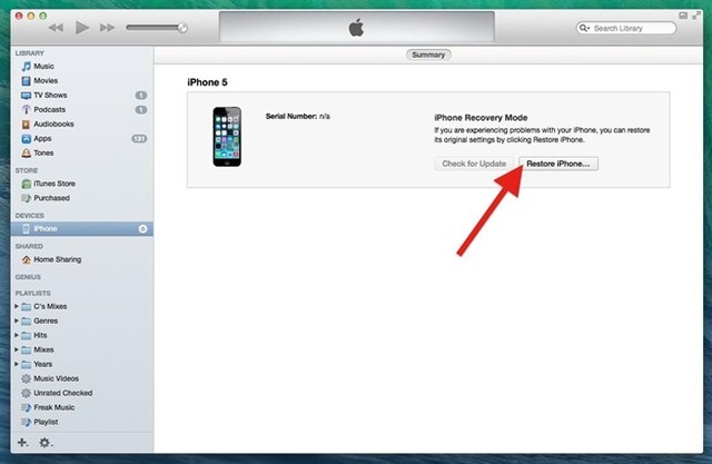 Để tiến hành Restore, bạn hãy kết nối thiết bị với máy tính đã cài đặt sẳn phần mềm iTunes và chờ iTunes nhận dạng thiết bị đang ở chế độ Recovery bằng thông báo với lựa chọn Restore hoặc Update. Bạn hãy nhấn vào lựa chọn Update nếu không có sẳn gói Firmware hoặc nhấn phím Shift + nhấn vào Restore để tiến hành khôi phục thông qua gói tin Firmware có sẳn trên máy tính.