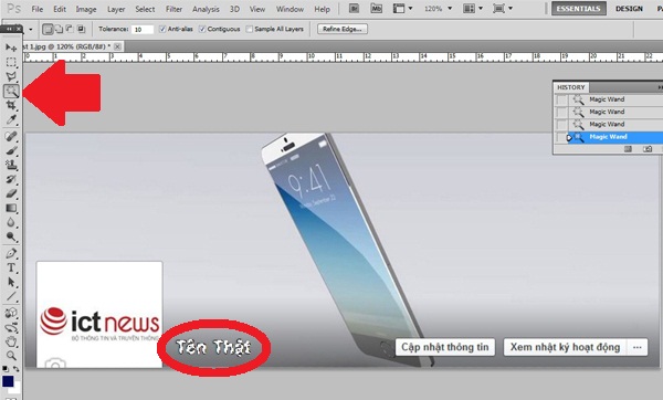 | Làm tên Facebook phát sáng: Dùng Photoshop mở file ảnh vừa được cắt gọt ban đầu từ bước 1 lên. Tìm chọn công cụ Magic Wand Tool (mũi tên) rồi giữ Shift và chọn hết các phần màu đồng dạng của cái tên của bạn (khoanh đỏ). |