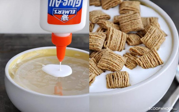 Bởi vậy, để giữ cho món ăn luôn hấp dẫn, sữa trong quảng cáo ngũ cốc được thay hoàn toàn bằng... dung dịch keo trắng. Làm như vậy, các miếng ngũ cốc không bị thấm đẫm nước và vẫn có cảm giác rất giòn.