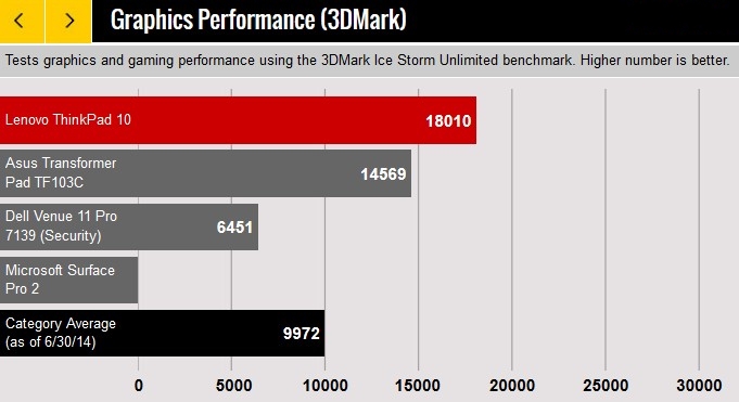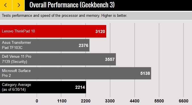 Trong các bài benchmark, Lenovo ThinkPad 10 cũng chỉ thể hiện được một phần sức mạnh của mình so với các đối thủ.