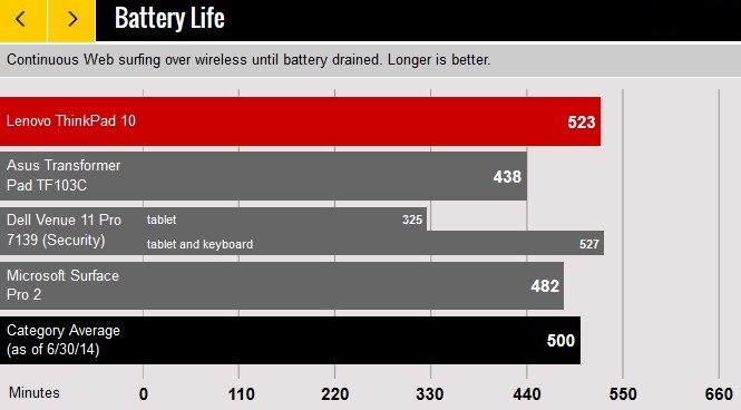 Thời gian trên là dài hơn 23 phút so với mức trung bình (8:20) của tablet, 41 phút so với Surface Pro 2 và Dell Venue 11 Pro (08:00) khi không đi kèm dock. Nhưng nếu đi kèm dock, thời lượng pin của Venue 11 Pro có thể kéo dài tới 15 giờ 40 phút.