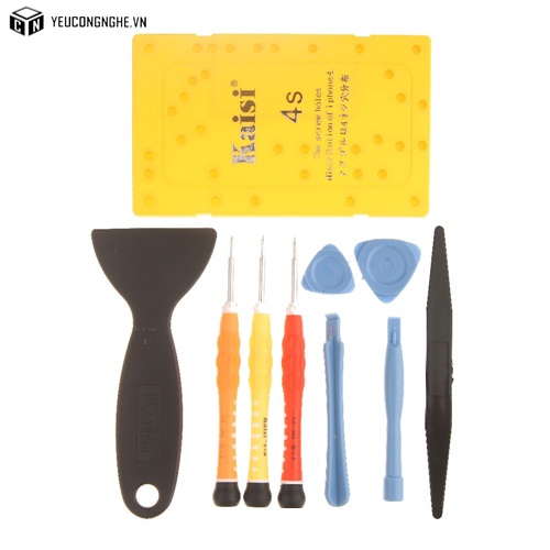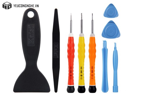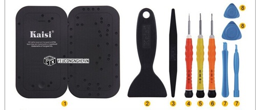 - 10 dụng cụ như trong hình ảnh: Bộ tô vít mở, đĩa đặt, dụng cụ bảo vệ tấm film, miếng nậy vỏ...