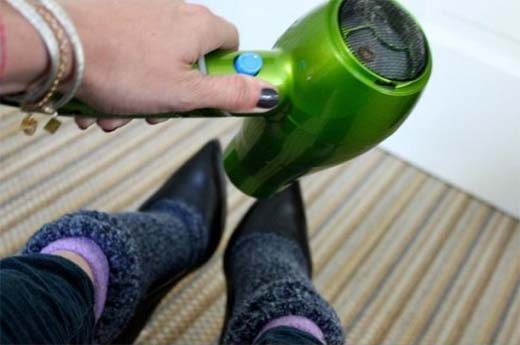 7. Một ngày nào đó, đôi giày trở nên quá nhỏ so với bàn chân, bạn không tài nào xỏ chân vào được nhưng giày vẫn còn mới và bạn vẫn còn thích diện chúng, hãy thử cách này: Mang vào chân khoảng 3 chiếc tất, ướm vào giày, sau đó dùng máy sấy xung quanh khoảng 10 phút, bạn có thể thấy điều kì diệu!