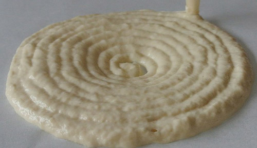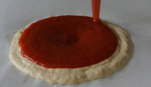 Các thành phần của bánh pizza được in theo từng giai đoạn, đầu tiên là phần bột để làm đế bánh.  |