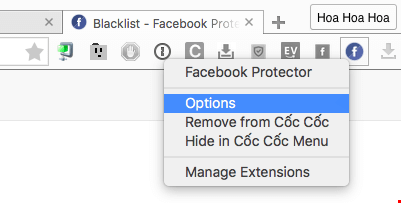 Để ngăn chặn vấn đề này, người dùng chỉ cần cài đặt tiện ích Facebook Protector cho trình duyệt Google Chrome, Cốc Cốc, Yandex… tại địa chỉ https://goo.gl/ibGjtS. Sau khi hoàn tất, bạn nhấn phải chuột vào biểu tượng của chương trình ở góc trên bên phải trình duyệt và chọn Options.