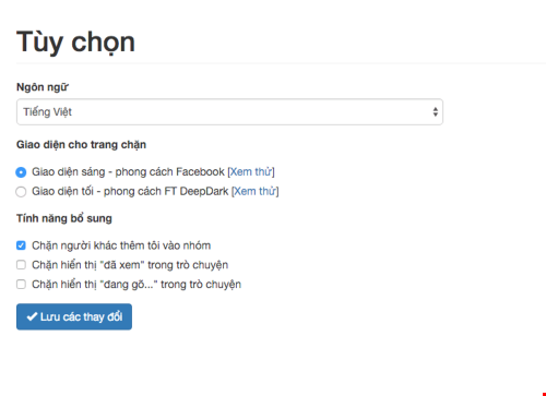 Để dễ sử dụng hơn, bạn có thể thay đổi lại ngôn ngữ hiển thị là tiếng Việt. Giao diện chính của Facebook Protector tương đối đơn giản, nếu muốn chặn người khác thêm bạn vào nhóm thì đánh dấu chọn vào ô Chặn người khác thêm tôi vào nhóm. Ngoài ra, bạn còn có thể chặn hiển thị chữ "đã xem" trong trò chuyện, hoặc chặn hiển thị biểu tượng… khi đang nhập tin nhắn, cuối cùng lưu lại các thay đổi để áp dụng.