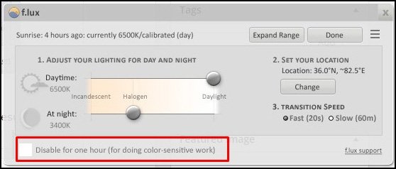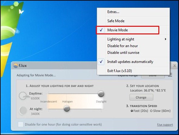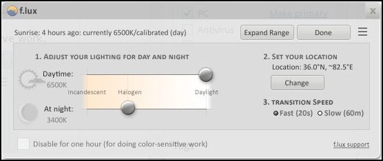 Giải pháp phụ thuộc vào một phần mềm thú vị, có tên là F.lux. Đây là ứng dụng có thể được dùng để thiết lập thời gian thay đổi độ sáng màn hình dễ dàng theo thời điểm trong ngày và thậm chí cả địa điểm của bạn nhờ sự hỗ trợ của GPS.