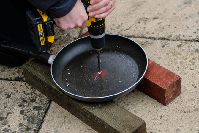 Một trong những cách thú vị nhất mà PetaPixel gợi ý là sử dụng một chiếc chảo cũ. Mặt chảo rất rộng nên có thể giữ máy chắc, và phần viền chảo sẽ giúp ngăn các tác động bên ngoài. Tất cả những gì bạn cần là một cái chảo, khoan, ốc vít và một đầu gắn máy ảnh (bạn có thể tháo từ tripod ra).