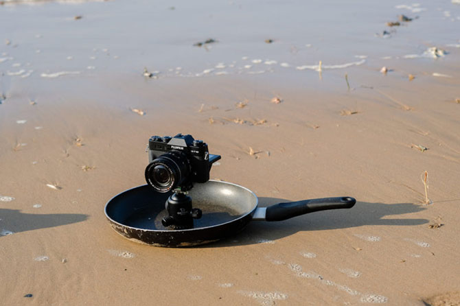 Do đáy chảo có ốc bắt xuyên qua nên nó sẽ không bằng phẳng, có thể không phù hợp khi đặt lên nền đá cứng, tuy nhiên nếu đặt lên nền cỏ, cát hoặc đất thì rất hợp. Tác giả bài viết trên PetaPixel đã thử gắn một chiếc Fujifilm X-T10 lên chảo, và có thể mang nó ra ngoài biển để chụp vì lòng chảo sẽ giúp ngăn nước hoặc cát không bị bắn vào máy ảnh.