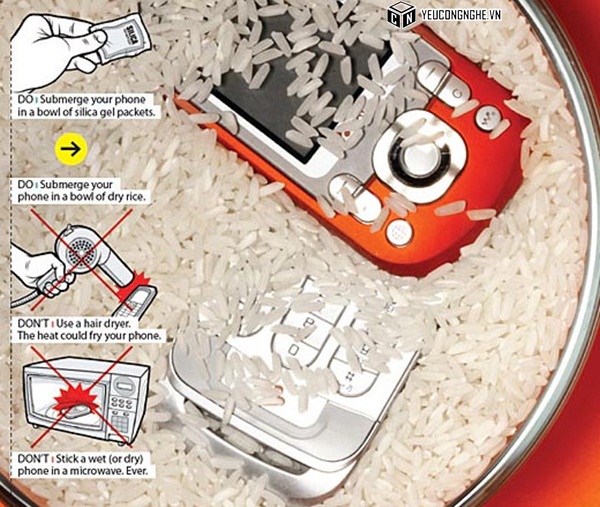 Trước hết, hãy vớt lấy điện thoại ra khỏi nước ngay lập tức. Nếu điện thoại vẫn đang bật, hãy tắt nguồn càng nhanh càng tốt để tiết giảm nguy cơ nó bị chập mạch. Sau đó, cho gạo khô hoặc các gói hút ẩm (silica) vào bên trong một chiếc túi lớn và bỏ smartphone của bạn vào giữa. Gạo và silica sẽ hút chất lỏng từ điện thoại của bạn, khiến bên trong không bị ẩm ướt.