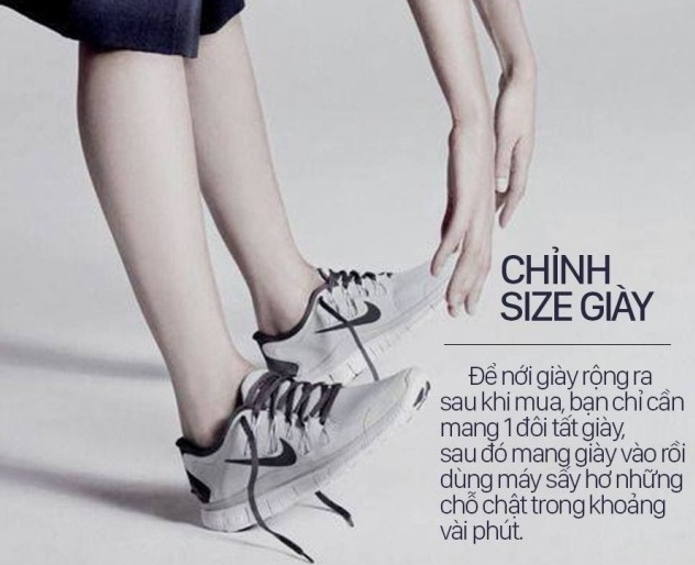 Để nới rộng giày ra sau khi mua, bạn cần mang một đôi tất dày, sau đó đi giày vào rồi dung máy sấy hơ chỗ chật trong khoảng vài phút.