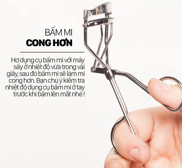 Hơ dụng cụ bấm mi với máy sấy trong vài giấy sau đó bấm mi sẽ làm mi cong hơn.