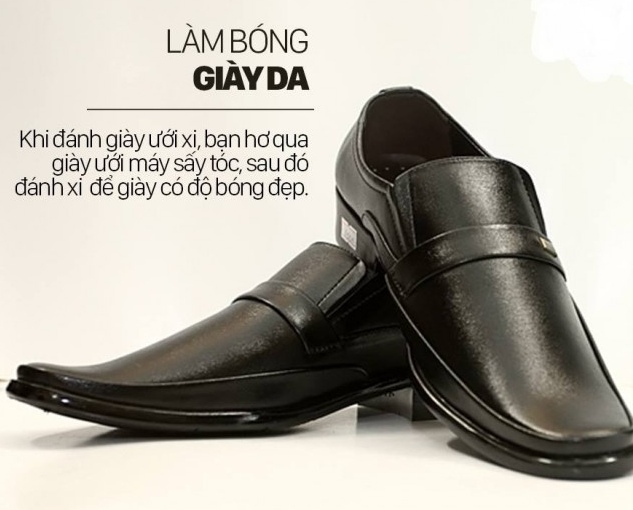 Khi đánh giày với xi, bạn hơ qua giày với máy sấy tóc sau dó đánh xi để giày có độ bóng đẹp.