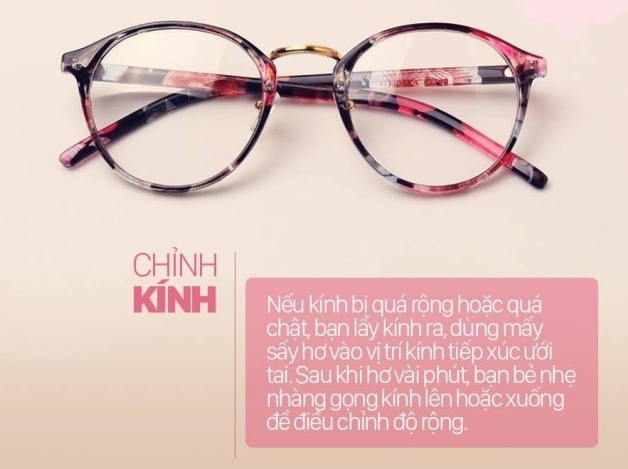 Nếu kính quá rộng hoặc quá chật, bạn lấy kính ra, dùng mát sấy hơ vào vị trí kính tiếp xúc với tai. Sau khi hơ vài phút, bạn bẻ nhẹ nhàng gọng kính lên hoặc xuống để điều chỉnh độ rộng.