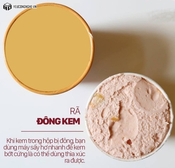 Khi kem trong hộp bị đông, bạn dùng máy sấy hơ nhanh để kem bớt cứng là có thể dùng thìa xúc ra được.