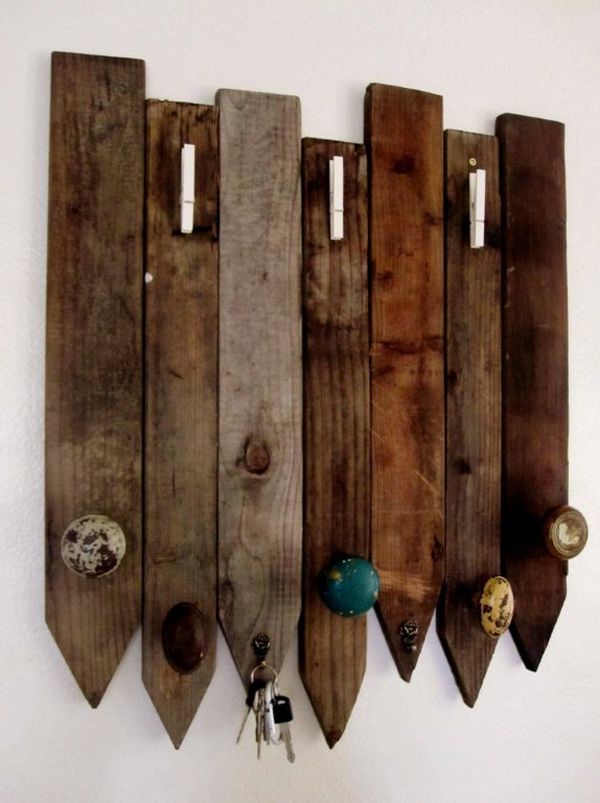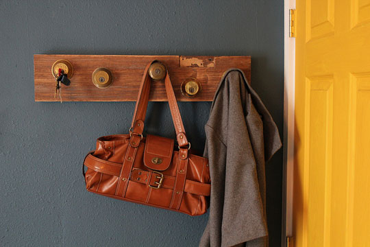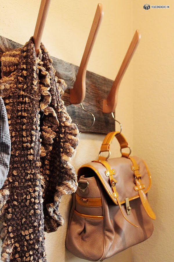 Thêm một chiếc giá treo sử dụng các miếng gỗ ghép lại với nhau chỉ có điều ý tưởng này không cần đến những miếng gỗ có kích thước bằng nhau. Sử dụng tay nắm cửa cũ để làm móc treo đồ, nếu muốn bạn có thể thêm vào các móc nhỏ phía bên dưới để treo chìa khóa.