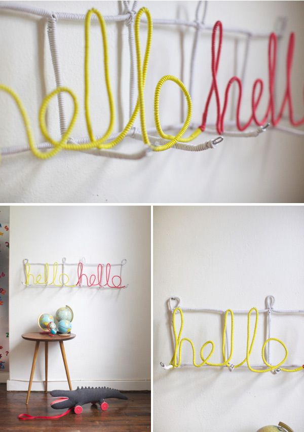 Một thiết kế giá treo đồ rất cầu kỳ và đẹp mắt, nó sử dụng dây thép để tạo hình thành các dòng chữ ấn tượng. Vật liệu được sử dụng chủ yếu là dây thép, vỏ dây điện thoại, các dải băng và kìm bấm.