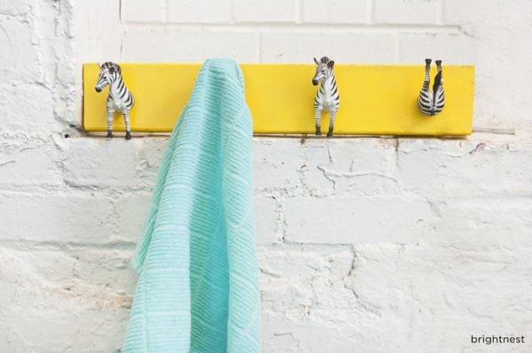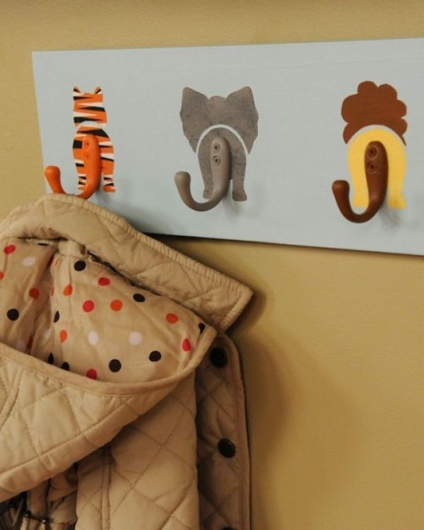 Một giá treo đồ rất hết sức dễ thương và tiện dụng, nó được làm từ một tấm bảng gỗ cùng với các món đồ chơi được gắn lên, phần chân thò ra ngoài chính là phần móc để treo đồ. Đương nhiên là thiết kế này chỉ có thể treo được những món đồ nhẹ nhàng như áo sơ mi, áo phông hay một chiếc khăn nhỏ.