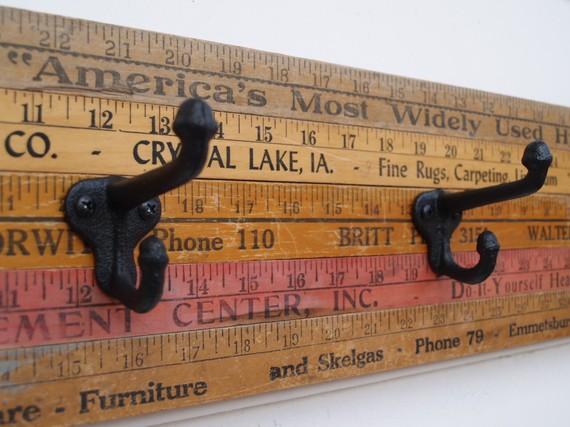 Ý tưởng này sử dụng những chiếc thước cũ gắn lại với nhau và sau đó là gắn thêm vào các móc treo đơn giản. Bạn cũng có thể gắn thêm một số phụ kiện để trang trí cho chiếc giá treo này trở nên ấn tượng hơn.