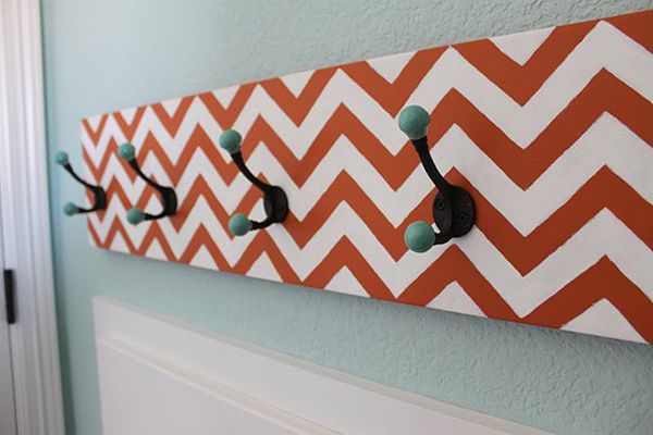 Một chiếc giá treo đồ rất quen thuộc với hầu hết mọi người, điểm độc đáo ở thiết kế này nằm ở tính thẩm mỹ của nó, những móc nhỏ hình chữ V cách điệu được gắn lên một bảng gỗ cũng được sơn những họa tiết hình chữ V. Đơn giản, đẹp mắt và dễ làm là những ưu điểm của chiếc giá treo đồ này.